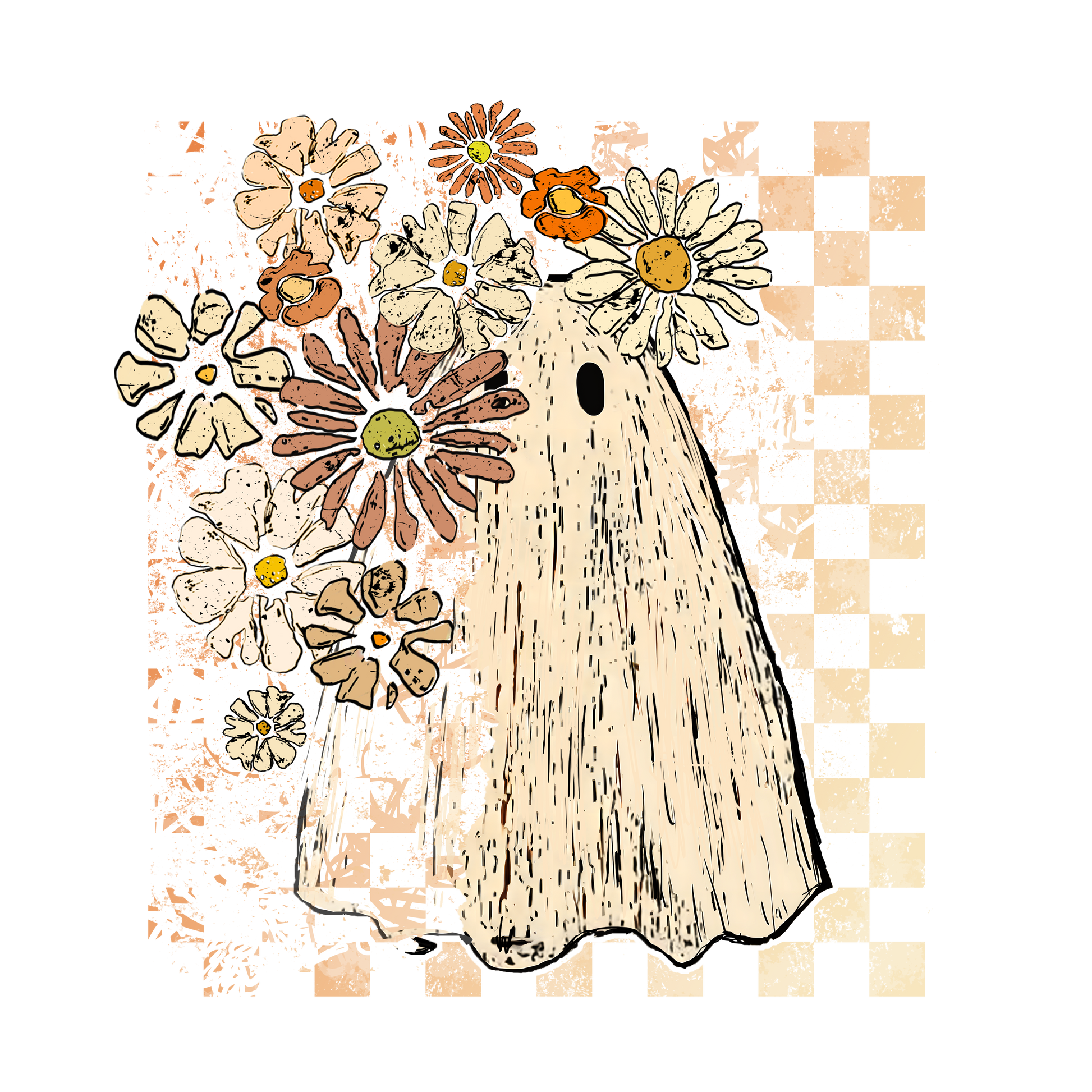 Bring spooky season to life with a soft boho twist! This Floral Ghost DTF Transfer features a whimsical ghost surrounded by vintage-inspired fall florals in muted tones of blush, rust, and ivory. The distressed texture adds a cozy, worn-in feel—perfect for boutique-style tees, sweatshirts, or tote bags.