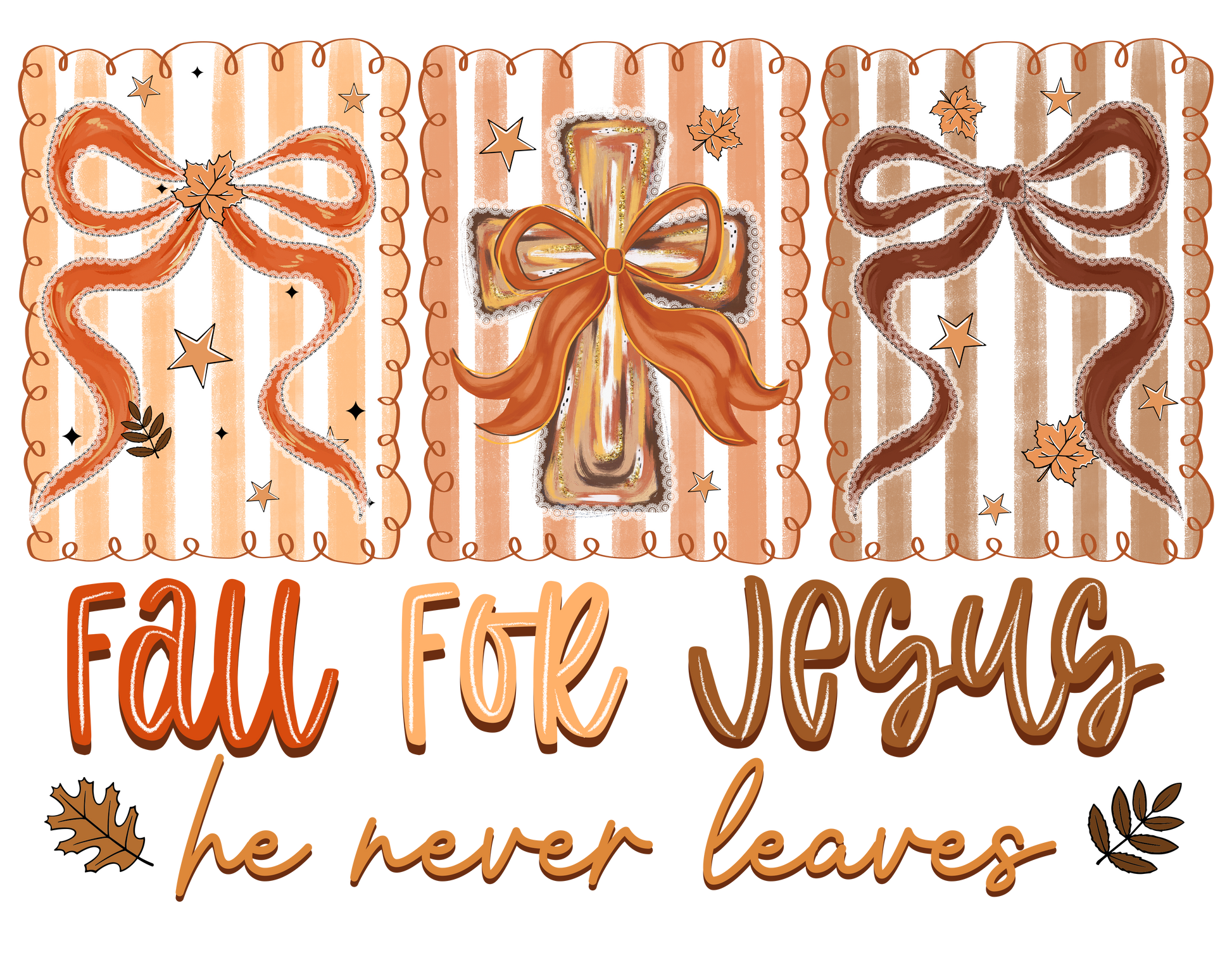 Celebrate faith this fall with our “Fall for Jesus, He Never Leaves” DTF transfer. Ready to press and perfect for cozy seasonal apparel.