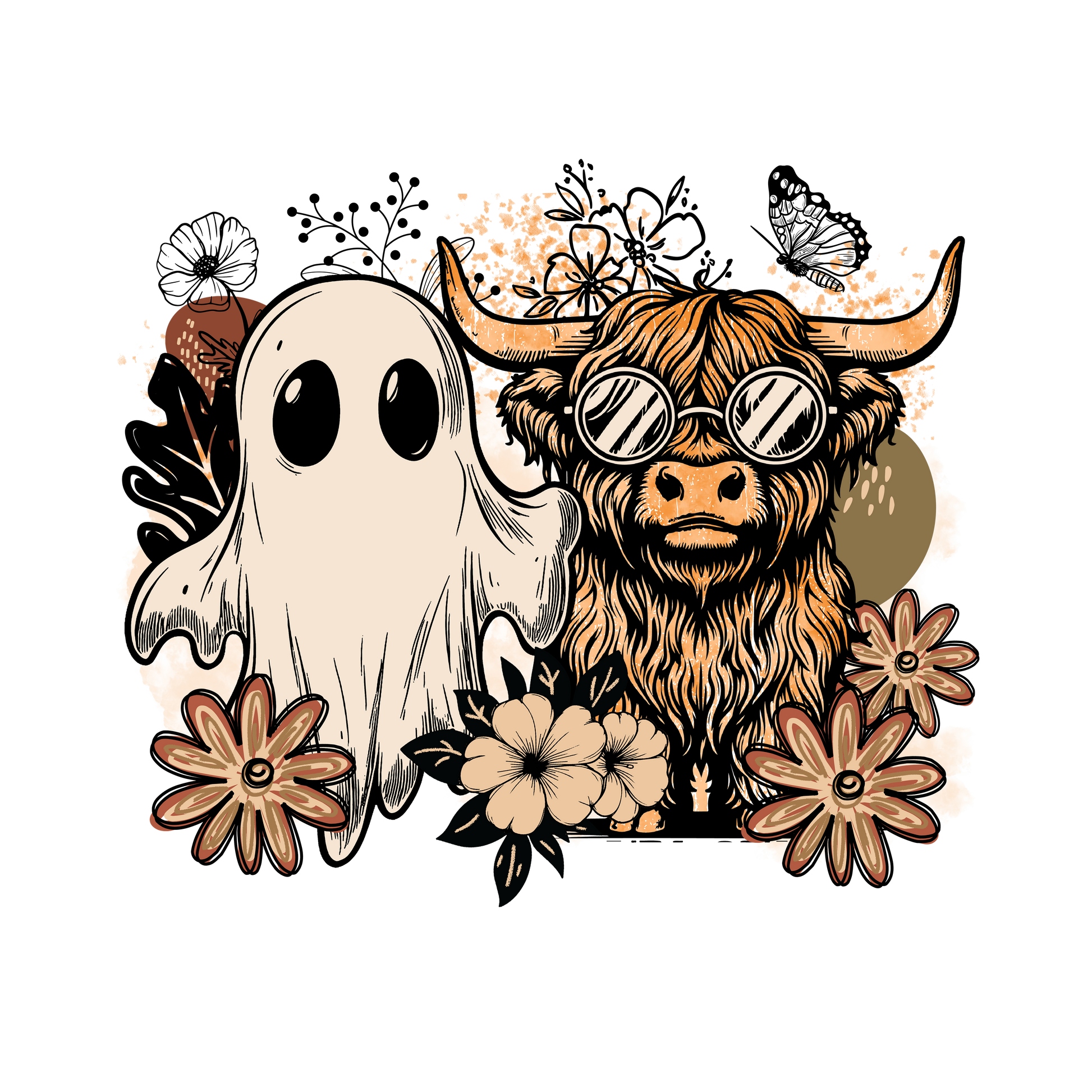 Wrap your wardrobe in whimsy this season with our Floral Ghost & Highland Cow Fall DTF Transfer! This charming design blends rustic farmhouse charm with playful Halloween spirit, featuring a sweet Highland cow adorned in autumn florals alongside a friendly ghost nestled in fall foliage.
