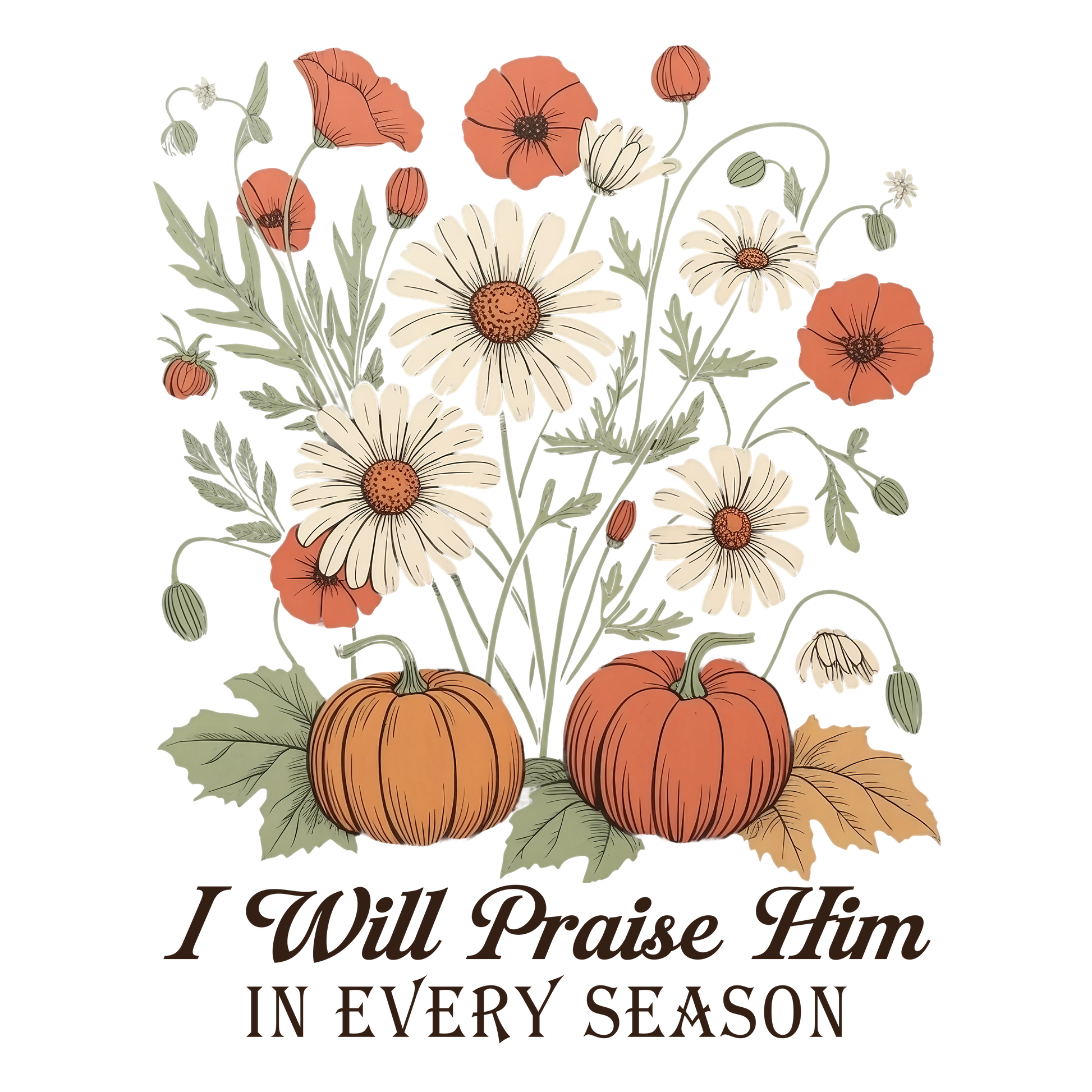 This this beautifully designed DTF transfer featuring a soft floral motif and the inspiring message: “Praise Him in Every Season.” Perfect for expressing your faith through fashion, this design centers around Jesus and the timeless beauty of worship in every stage of life.