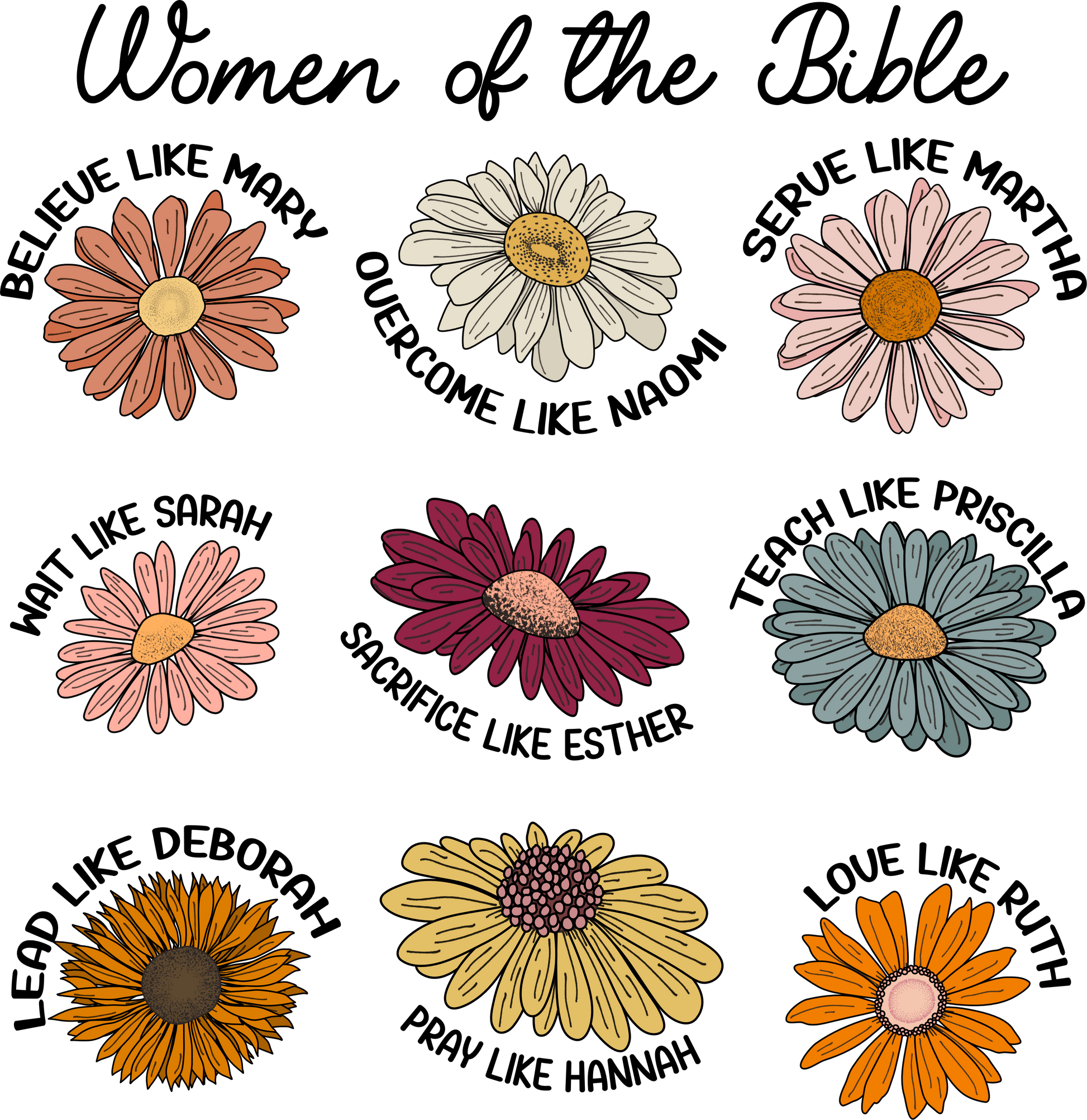 Celebrate the enduring strength and grace of biblical women with this elegant DTF transfer. Showcasing iconic figures such as Ruth, Esther, Mary, and Deborah, it honors their wisdom, bravery, and steadfast faith. Designed for vibrant color and lasting quality, this transfer is ideal for enhancing apparel, tote bags, or home décor with a meaningful and refined touch.
